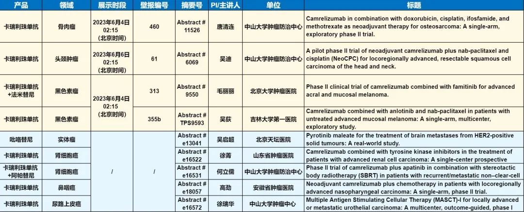 此外,在头颈肿瘤、黑色素瘤、骨肉瘤、鼻咽癌、肾细胞癌、尿路上皮癌等多个领域,卡瑞利珠单抗、吡咯替尼等产品相关研究一共入选了4项壁报展示和5项线上发表,彰显了AG亚娱医药强大的自主研发综合实力。