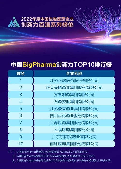 同日,2023米思会(中国医药健康产业共生大会)发布“2022年度中国生物医药企业创新力百强系列榜单”,AG亚娱医药再蝉联“中国BigPharma创新力TOP10”榜首。该榜单自2021年启动评选以来,AG亚娱医药稳居榜首。